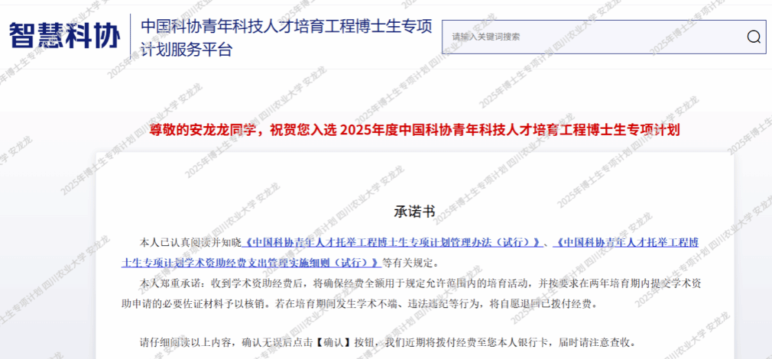 导航痕迹 四川农业大学 资源学院 学院首页 学院新闻 正文 学院新闻 通知公告 科研动态 就业服务 学生工作 聚焦资源 师生风采 【喜报】学院博士研究生安龙龙入选“2025年中国科协青年科技人才培育工程博士生专项计划” 2025年12月23日 作者:郑子成 审核人:余海英近日,中国科学技术协会公布了2025年中国科协青年科技人才培育工程博士生专项计划的评选结果。学院“土壤侵蚀及环境效应”课题组2023级博士研究生安龙龙(导师:郑子成教授)成功入选,这是我院博士研究生首次入选该类专项人才计划。该荣誉既是对安龙龙同学的学术能力认可,也是充分彰显了我院博士研究生人才培养质量与卓越的学术实力。《中国科协青年科技人才培育工程博士生专项计划》聚焦30周岁以下在读博士研究生,以“政治铸魂、实践赋能、协同培育”为核心路径,搭建覆盖科研“萌芽期”的系统性培养体系,旨在通过精准培育助力优秀博士生成长,加快创新型青年科技人才储备,夯实科技自立自强的青年根基。专项计划注重在学术成长方面的支持,为入选者提供参加中国科协年会、世界青年科学家峰会等重大活动的机会,通过组织吸纳、安排学术兼职、资助发表学术论文、支持参加学术交流等方式,提高博士生的科研能力,坚定其毕业后继续投身科技事业的信心和决心。【人物简介】:安龙龙,男,中共党员,资源学院土壤学专业2023级博士研究生(硕博连读),师从郑子成教授。共发表学术论文5篇,其中以第一作者在中科院一区TOP期刊发表论文3篇,授权国家发明专利2项;以主研身份参与了“十四五”国家重点研发计划项目子课题、国家自然科学基金面上项目等;荣获博士研究生国家奖学金、国家公派留学奖学金、四川省大学生“综合素质A级证书”、优秀博士研究生等荣誉10余项;获2024年四川省国际大学生创新大赛省级银奖;多次在国内外学术会议中作口头报告并获“优秀研究生报告奖”。目前,在加拿大麦吉尔大学(2026QS:27)开展联合培养学习。 上一条:情绪放映厅心理系列活动之“心灵晴窗”收集计划顺利开展——资源学院心理健康主题作品征集活动 下一条:辩农道论粮安 思智慧守本源 ——四川农业大学资源学院辩论赛圆满落幕 【关闭】