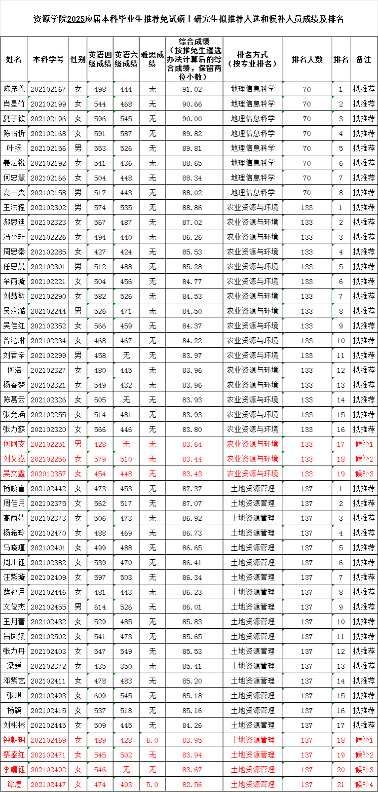 导航痕迹 四川农业大学 资源学院 学院首页 通知公告 正文 学院新闻 通知公告 科研动态 就业服务 学生工作 聚焦资源 师生风采 资源学院2025年推荐优秀应届本科毕业生免试攻读研究生拟推荐和候补名单公示 2024年09月19日 2021级全体学生: 经学生本人自愿申请、资格审查,报学院2025年推荐免试研究生遴选工作小组核准,学院党政联席会通过,现将学院2025年推荐优秀应届本科毕业生免试攻读研究生拟推荐和候补名单予以公示。 广大师生若对名单有异议,请于9月26日17:00前实名向学院行政办公室杨绍凤老师反映。 邮箱:594868518@qq.com 办公地点:3-318 拟推荐和候补名单如下: 资源学院行政办公室 2024年9月18日 上一条:关于四川农业大学第八届“金土地杯”美丽乡村国土规划空间大赛入围决赛名单的公示 下一条:资源学院关于成立奖励资助相关机构的通知 【关闭】