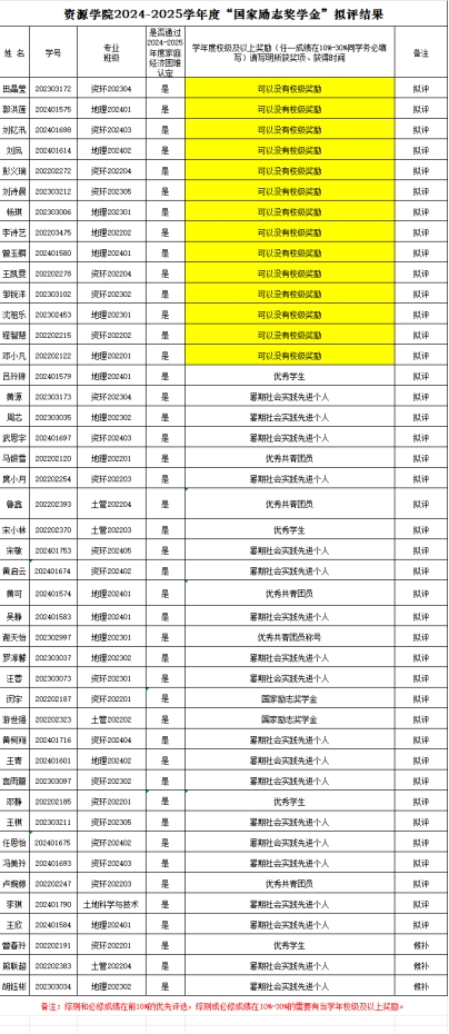 导航痕迹 四川农业大学 资源学院 学院首页 通知公告 正文 学院新闻 通知公告 科研动态 就业服务 学生工作 聚焦资源 师生风采 资源学院关于2024-2025学年度 “国家励志奖学金”拟评结果的公示 2025年10月13日 学院全体同学: 经学生自愿申请,班级推荐,学院资格审查,根据国家励志奖学金的评选要求,学院评审委员会集体评审,满足双10%同学优先拟评,双30%成绩排名平均比值依次拟评的评选原则,现将2024-2025年度“国家励志奖学金”拟评结果予以公示: 公示时间:10月13日-16日,如有异议请于公示期内实名反馈到学院党委办公室。 联系人:李相君 罗小利 冯美玲 卢欣怡 联系电话:86293010 联系地点:3-316 特别提醒: 1.拟评同学以“班级+姓名”的命名方式入群(群号1056216804); 2.拟评同学提前下载填好《国家奖学金评审表》并打印,于10月14日中午12:30在4B105开展培训会时带上统一修改完善; 3.培训会后拟评同学方可在四川省资助系统中(https://www.scxszz.cn/pros/identity/index.action)完成相应申请。 国家励志奖学金申请审批表.doc 资源学院 2025年10月13日 附件【国家励志奖学金申请审批表.doc】 上一条:关于开展2025-2026学年度“国家助学金”评定相关工作的通知 下一条:资源学院2025年研究生荣誉称号拟推人选公示 【关闭】