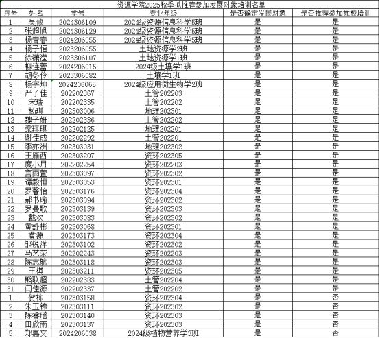 导航痕迹 四川农业大学 资源学院 学院首页 通知公告 正文 学院新闻 通知公告 科研动态 就业服务 学生工作 聚焦资源 师生风采 关于确定2025年秋季发展对象及推荐参加党校培训学员名单公示 2025年10月16日 根据《中国共产党章程》、省教育工委《关于加强新形势下发展党员和党员管理工作的实施意见》,按照“控制总量、优化结构、提高质量、发挥作用”的总要求,经各党支部考察推荐、学院党委审批,现确定严子佳等36位同志为2025年秋季学期发展对象,推荐王雁西等31位同志参加本期校党校发展对象培训班培训,现将具体名单公示如下,公示期为2025年10月16日——2025年10月22日。 公示期间,若有异议请及时以真实姓名向资源学院党委办公室刘丹反映。 地 点:3教316室。 中共四川农业大学资源学院委员会 2025年10月16日 上一条:资源学院关于2024-2025学年“陈育新优秀学生奖学金二等奖”和“优秀学生奖学金”拟评结果的公示 下一条:学院关于做好2025-2026学年(上)发展团员工作的通知 【关闭】