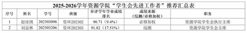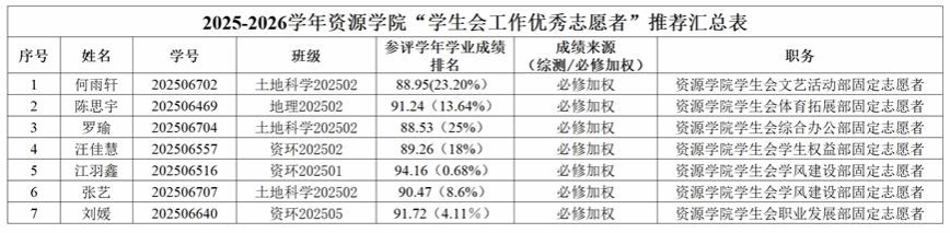 导航痕迹 四川农业大学 资源学院 学院首页 通知公告 正文 学院新闻 通知公告 科研动态 就业服务 学生工作 聚焦资源 师生风采 资源学院2025-2026学年学生会先进工作者、学生会工作优秀志愿者拟评结果公示 2026年04月03日 学院全体同学:根据2025-2026学年学生会先进工作者、学生会工作优秀志愿者参评条件规定,经学生自主申报、学院资格审查、评审委员评审,现将拟评结果面向全院公示,公示期为2026年4月3日-4月5日,如有异议请实名向学院反映。联 系 人:唐毓联系地点:3-316联系电话:028-86293010资源学院2026年4月3日 上一条:关于学院2025-2026学年团内评优结果的公示 下一条:资源学院2026年硕士研究生招生调剂方案 【关闭】