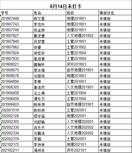 导航痕迹 四川农业大学 资源学院 学院首页 通知公告 正文 学院新闻 通知公告 科研动态 就业服务 学生工作 聚焦资源 师生风采 资源学院关于5月13日、5月14日、5月15日未建卡打卡同学的通报 2022年05月16日 全院同学: 现将5月13日、5月14日、5月15日未健康打卡的同学通报如下: 5月13日未打卡.xls 资源学院 2022年5月16日 附件【5月13日.xls】 上一条:资源学院关于档案邮寄地址核对及毕业生派遣工作的通知 下一条:资源学院关于开展核酸检测的通知 【关闭】